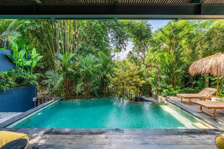 „Aura House“: Öko-Bambushaus mit 2 Betten, Pool und Blick auf den Fluss