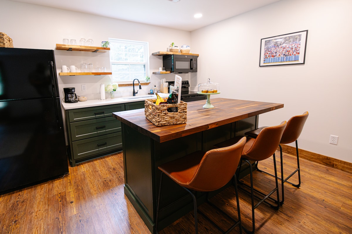 Spacious studio apartment with 10 ft ceilings and tall windows make it bright and airy. Located in a quiet, wooded neighborhood just a 10 minute drive from campus or the Square. Queen-sized bed, dual recliner loveseat, writing desk, bar top dining table, washer/dryer unit, and kitchen with full size refrigerator, microwave, and stovetop. Private outdoor patio that is fenced-in. Personalized door lock code for added security. Roku TV and free WiFi.