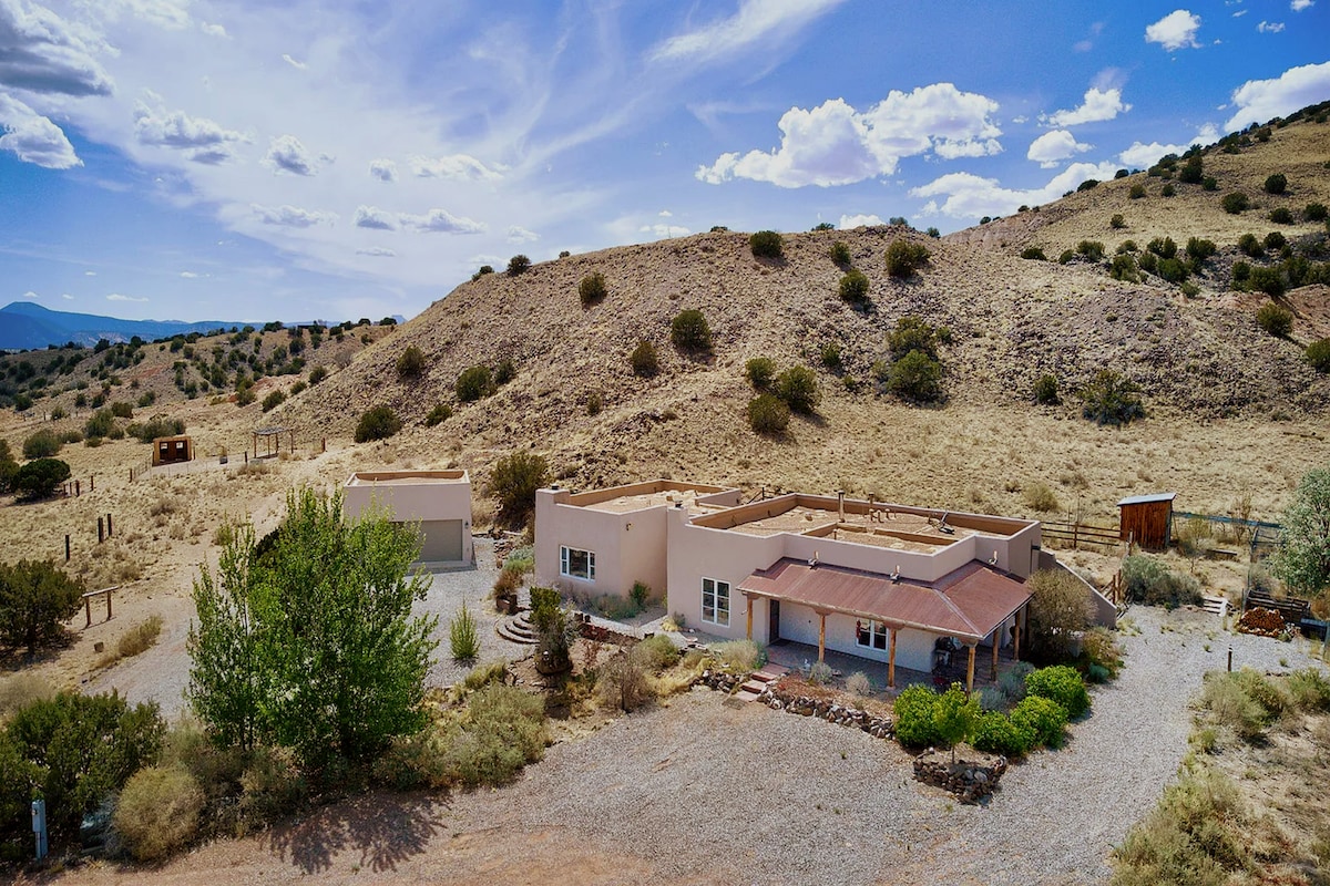Unser modernes Erdhaus ist ein gemütliches, von Handwerkern gebautes Nest, das seine Besucher mit Licht, offenem Raum und Farbe verwöhnt. Es hat eine ruhige, private Umgebung mit allem, was du benötigst, um deinen Aufenthalt komfortabel und hoffentlich inspiriert zu machen. Die Natur ist die andere Hälfte dieses Hauses und schafft ein umhüllendes Amphitheater aus Gärten, Vögeln, Bäumen und einer Hängematte. Jenseits dieses privaten Nestes befinden sich ein 360-Grad-Blick auf die Sangre de Christo Mountains, die Rio Grande Gorge, spektakuläre Sonnenuntergänge und kilometerlange Wander- und Radwege.