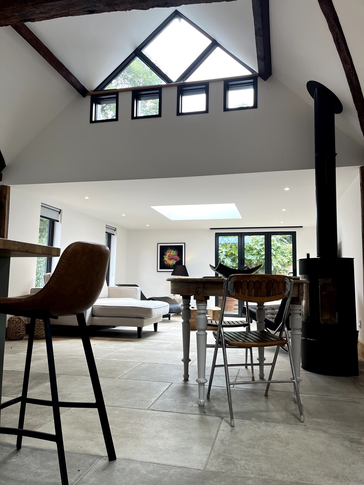 Herrliche freistehende Scheune aus französischer Eiche in einer ruhigen privaten Gasse auf einem umzäunten Landgut. Luxuriös ausgestattet mit voller Ausstattung für eine kurze Pause oder einen längeren Aufenthalt. Klimaanlage. Kostenlose EV-Ladestation. Viele öffentliche Wanderwege liegen ganz in der Nähe. Lokale Geschäfte sind nur 10 Gehminuten entfernt. Gastro-Kneipen, Restaurants und unabhängige Geschäfte sind zu Fuß erreichbar. Eine kurze Fahrt von der M25 (J11) entfernt. Schnelle Bahnverbindungen nach London von Woking. LGBTQ+ freundlich. Freundlicher Spaniel und siamesische Katze vor Ort.