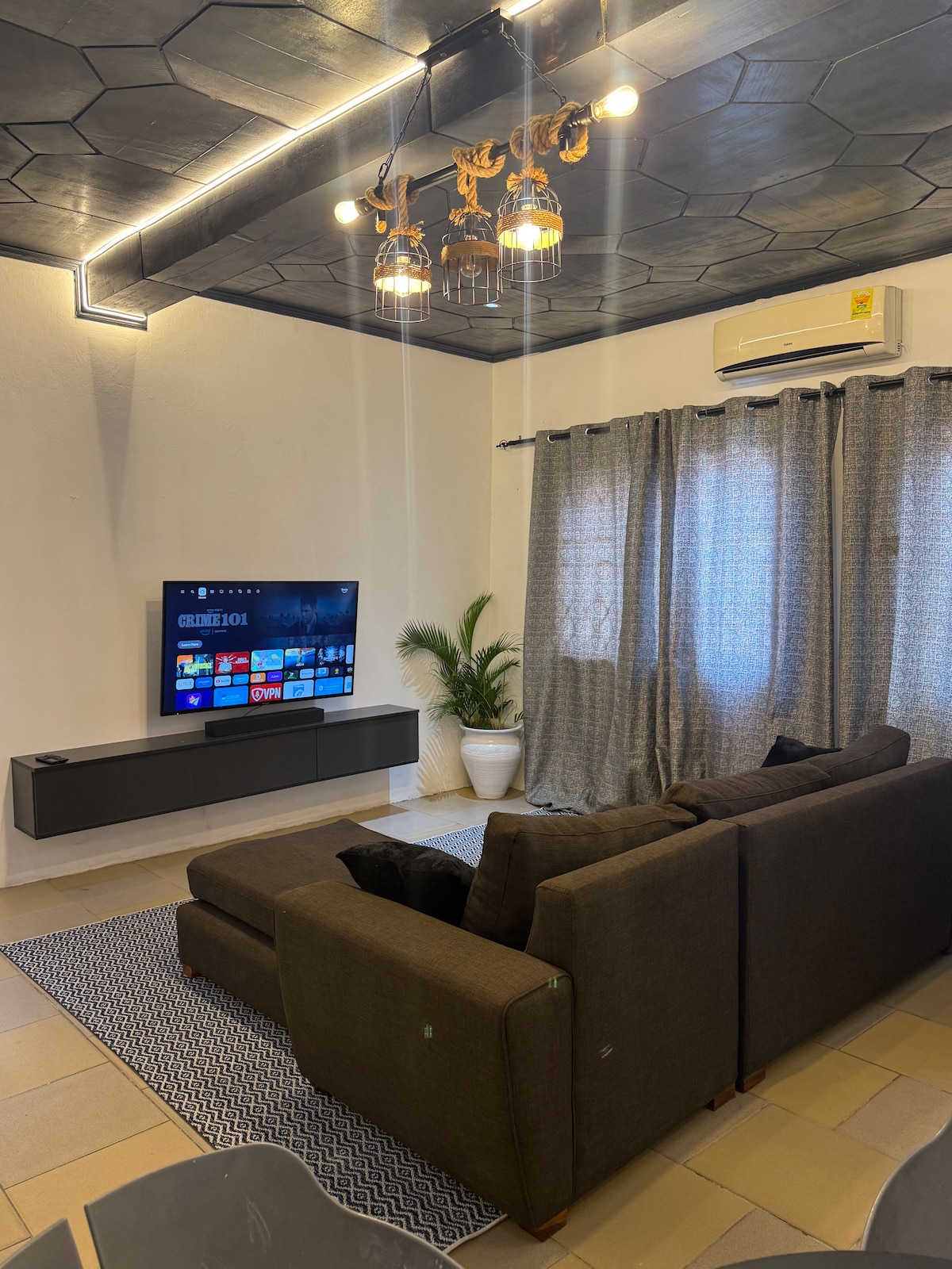 THE AURORA ANNEX: Moderne 2-Zimmer-Wohnung in East Legon – 25 Minuten vom Flughafen Kotoka entfernt. Genieße einen stilvollen, offenen Wohnbereich mit einem bequemen Ecksofa, einem Smart-TV mit Netflix, schnellem WLAN, einer Klimaanlage, einem Warmwasserbereiter und einem schicken Essbereich. Perfekt für Geschäftsreisende oder Freizeit, mit Top-Restaurants, Geschäften und Nachtleben in der Nähe. Es gibt auch einen 24-Stunden-Supermarkt und ein Restaurant