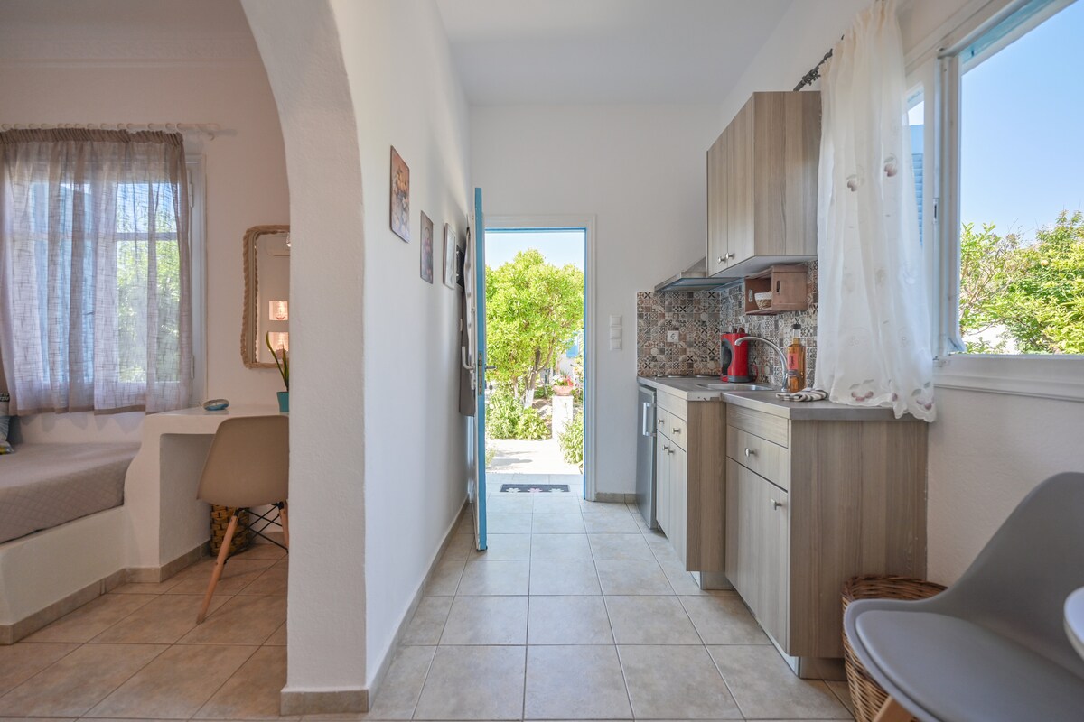 Eine schöne kykladische Wohnung von 21 qm, in einem Obstgarten, etwas außerhalb des Zentrums. Der Garten ist voller Bäume, Blumen, Obst und Gemüse. Ideal für alle, die die Natur lieben. Du bist im Zentrum und am Strand von Ag. Georgiou in 5 Minuten mit dem Fahrrad, Roller oder Auto. In 12 Minuten (mit dem Fahrzeug) bist du an den Stränden von Ag. Prokopiou & Ag. Anna. Wir empfehlen, ein Fahrzeug zu mieten, um den Zugang zu erleichtern. Das Zentrum liegt nur 30–35 Gehminuten entfernt. Es gibt einen kostenlosen Parkplatz.