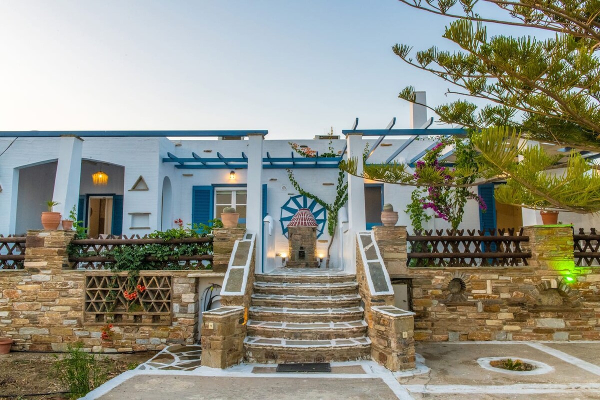 Tritt ein in ein einzigartig renoviertes traditionelles kykladisches Haus am Rande des Dorfes Ktikados. Lass deine Taschen fallen, öffne die Doppeltüren, die zur Terrasse führen, und mach es dir gemütlich, um einen amphitheatralischen Blick auf Berg und Meer zu genießen! Die Unterkunft besteht aus einer Reihe von Terrassen, die ideal für Mahlzeiten im Freien, zum Entspannen und für einen unvergleichlichen Blick auf den Sonnenuntergang sind. Tagsüber kannst du Überflüge der einheimischen Krähen erwarten, die einzigartig auf der Insel sind, und nach Sonnenuntergang, mondbeschienene Besuche der Täler-Schafe.