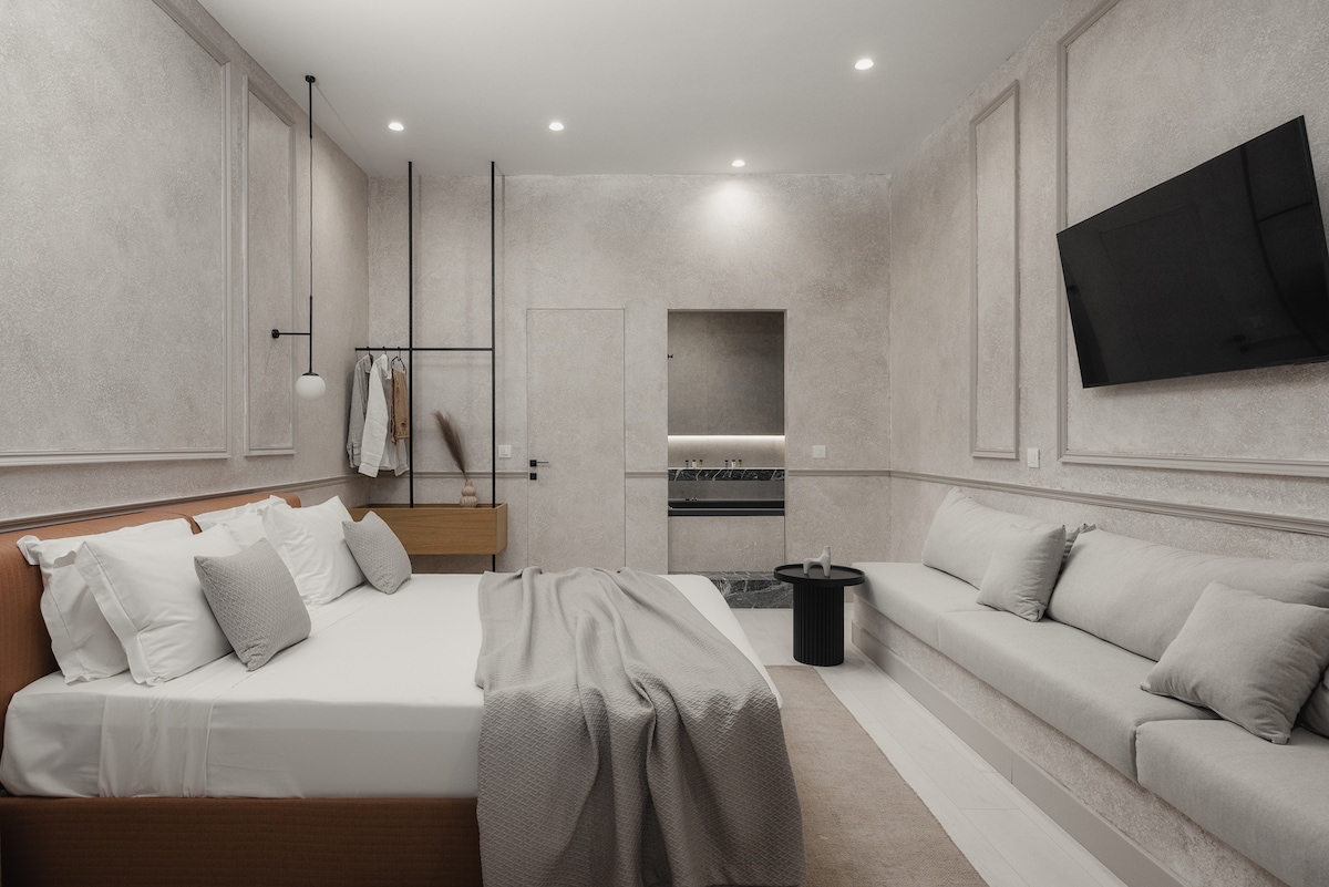 Luxury Suites by Lato wurden im Winter 2023 gerade renoviert, um mit der lokalen Architektur Schritt zu halten. Die Ästhetik, die Luxus inspiriert, dominiert das Interieur, während draußen ein privater Balkon mit einem Tisch seine anspruchsvollen Gäste lockt, die warme Ruhe, den Sonnenuntergang, den Meerblick und den Blick auf den See von Agios Nikolaos zu genießen. Die Suiten befinden sich in einem der zentralsten Teile der Stadt, nur wenige Meter vom Markt, der Küstenstraße und dem Voulismene-See entfernt.
