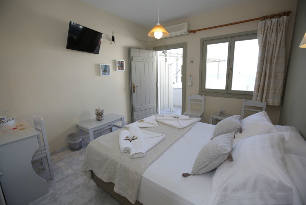 A very romantic room with magnificent sea view all over Piso livadi , the Aegean sea and the traditional pier . There is daily cleaning and after 2 days stay e change towels and every third day the sheets . We are always around in order to offer you a nice and pleasant stay in our place !!!