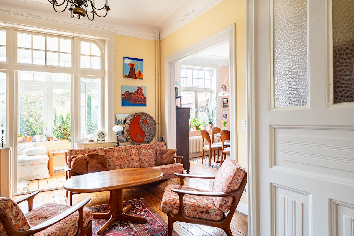Diese 100 Jahre alte Villa mit einem großen romantischen Garten, einem Gartenhaus mit Sauna, Tischtennis und Kamin lädt zum Entspannen ein. Es ist niedrige Entfernung zum Zentrum von Hamburg (13 Min. mit der Stadtbahn) und dem Strand des Eastsees.