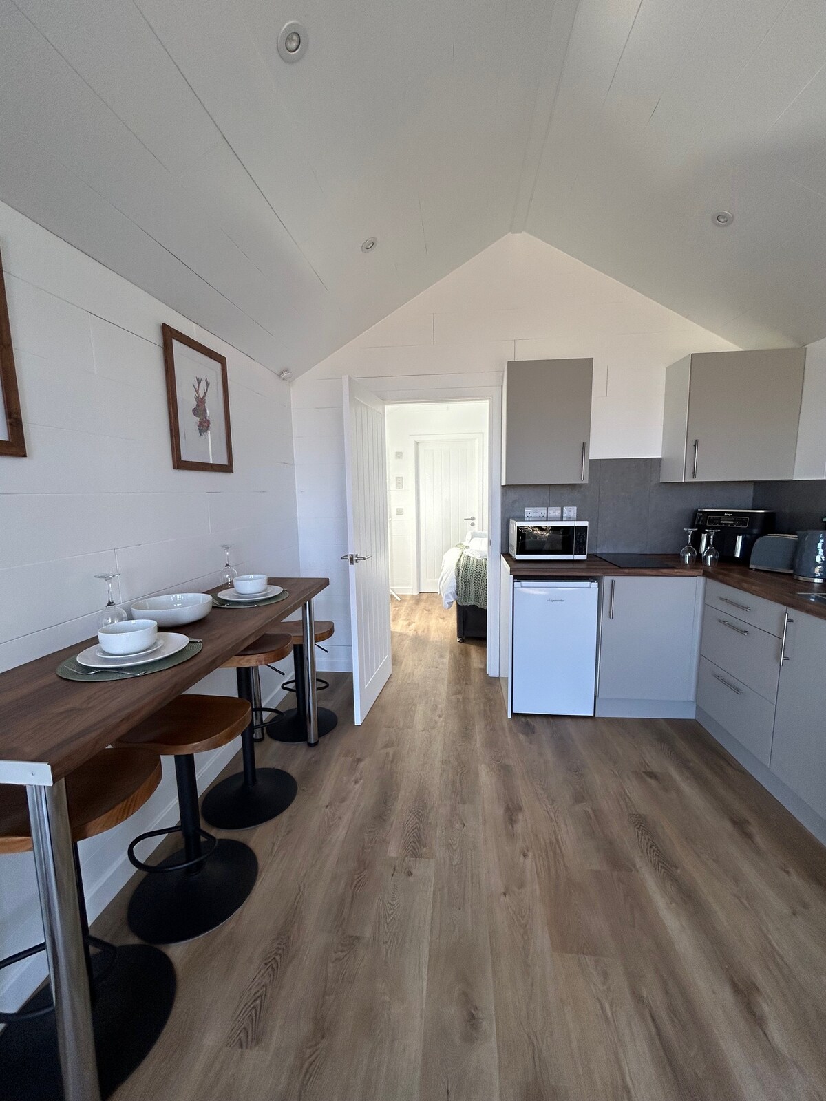 Hier ist unser neuer, gut ausgestatteter Schlafnischen-Pod. Er verfügt über Fußbodenheizung, Warmwasser, Induktionsherd mit zwei Kochfeldern, Kühlschrank mit Gefrierfach, Wasserkocher, Toaster, festes Doppelbett und Schlafsofa. Für deinen Komfort gibt es eine Toilette, ein Waschbecken und eine Dusche. Auch WLAN, Alexa, TV/DVD, Amazon Fire Stick (Netflix/Kinderfernsehen usw.). Er ist sehr komfortabel und gemütlich, mit superweicher, flauschiger Fleece-Bettwäsche und einer reinen Wolldecke. Es gibt auch einen Grillplatz mit Sitzgelegenheiten und Feuerstelle für entspannte Abende. Die Schlafnische befindet sich am Ende eines ruhigen Dorfes.