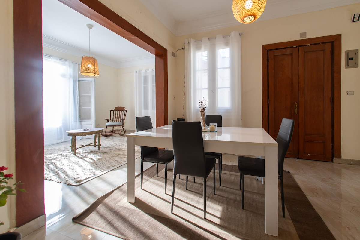 Located in the Sakakini historical building! Nested in the heart of Cairo, places you just steps away from vibrant markets, trendy cafés, and some of the city’s most iconic landmarks. 🏛️ 5' minutes to the Egyptian Museum/ Tahrir square 🚇 5' minutes walk to Metro Station ✈️20' minutes to New Cairo/ Airport 🛕20' minutes to the Pyramids Natural light streaming through 3 large, sunny panoramic balconies and 7 panoramic colored windows.