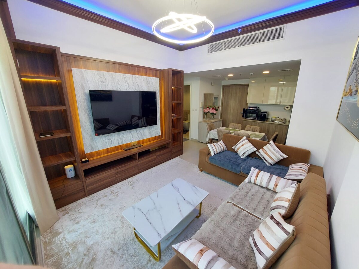 Betritt unsere atemberaubende Luxuswohnung mit 1 Schlafzimmer, die sorgfältig entworfen wurde, um Paare oder Alleinreisende ein unvergleichliches Erlebnis zu bieten. Perfekt für 2 Erwachsene oder 2 Erwachsene und ein Baby. Von dem Moment an, in dem du eintrittst, wirst du von einem eleganten, modernen Wohnraum begrüßt, der mit hochwertigen Oberflächen und durchdachten Details geschmückt ist. Entspanne dich im gemütlichen Sitzbereich, bereite eine Gourmet-Mahlzeit in der voll ausgestatteten Küche zu oder entspanne dich auf dem privaten Balkon mit einer Tasse Kaffee, während du die pulsierende Energie von Dubai genießt.