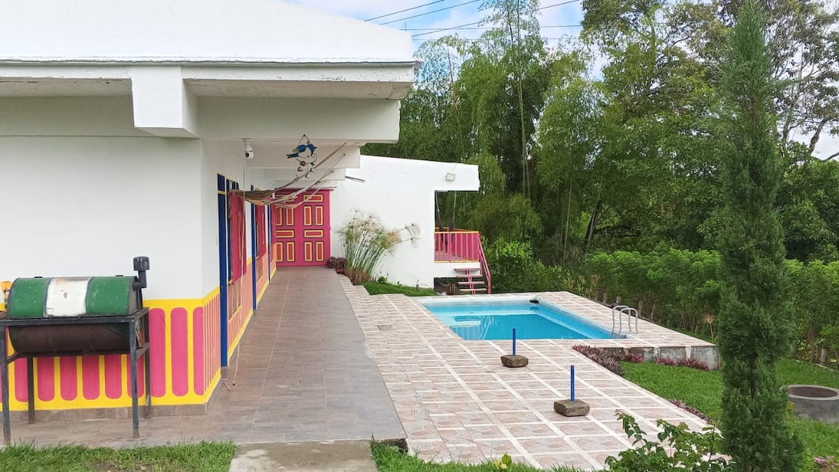 Genieße die Einfachheit dieser ruhigen und zentralen Unterkunft. Schönes Landgut, Kaffeeanbaugebiet, hat: Pool, Kiosk-Grill, Terrasse, Solarium, großer Parkplatz, 4 Zimmer, 4 Badezimmer und Landhausküche. Perfekter Ort, um ihn als Familie zu genießen. Minuten von Quimbaya, Alcala und Montenegro entfernt