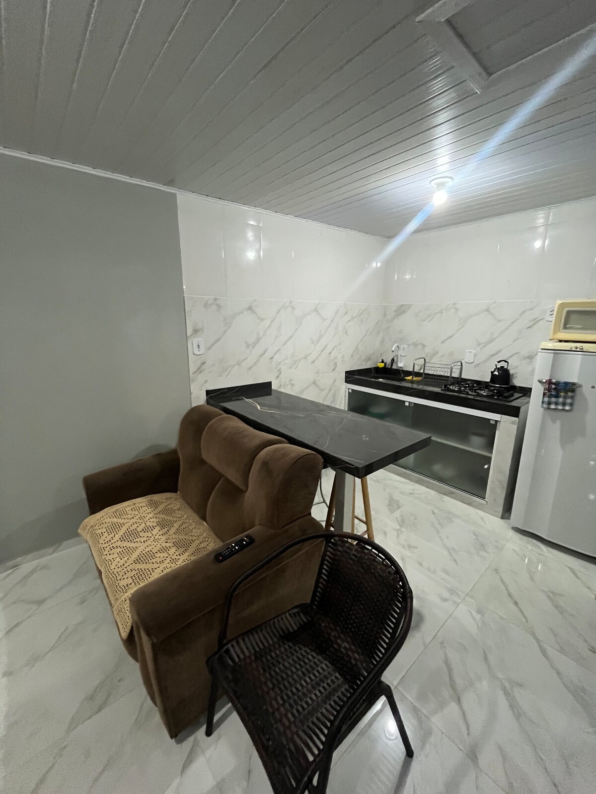 Casa sobrado, com dois quartos, sendo um quarto de casal com ar condicionado e outro quarto de solteiro com ventilador, sala de estar com lareira, cozinha conjugada, semi mobiliada, com fogão, chaleira elétrica, microondas, air fray, geladeira, possui dois banheiros e tem estacionamento gratuito.