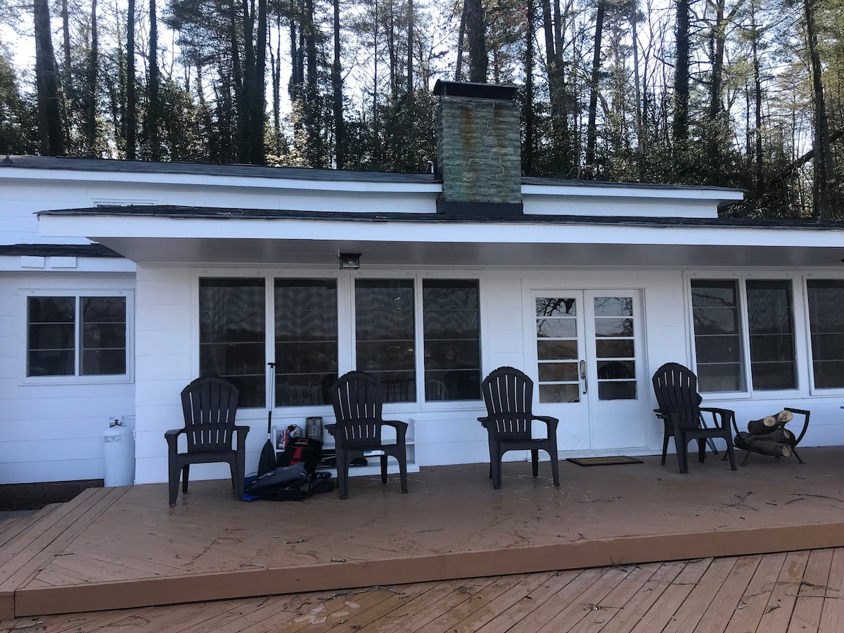 A beautiful private lake cottage on Lake Hickory in wooded area (rhododendron and exotic plants). Cottage has approx. 200 ft. of waterfront. Boat dock with seating and for recreation. House is contemporary and newly remodeled with 2 BR with 1 king bed and guest with queen bed , 2 Baths, Kitchen has natural stone counter tops, LR leather furniture .Baths have natural stone. There are two porches for gorgeous lake views. Stereo surround inside and outside the house. House 1100 sf.