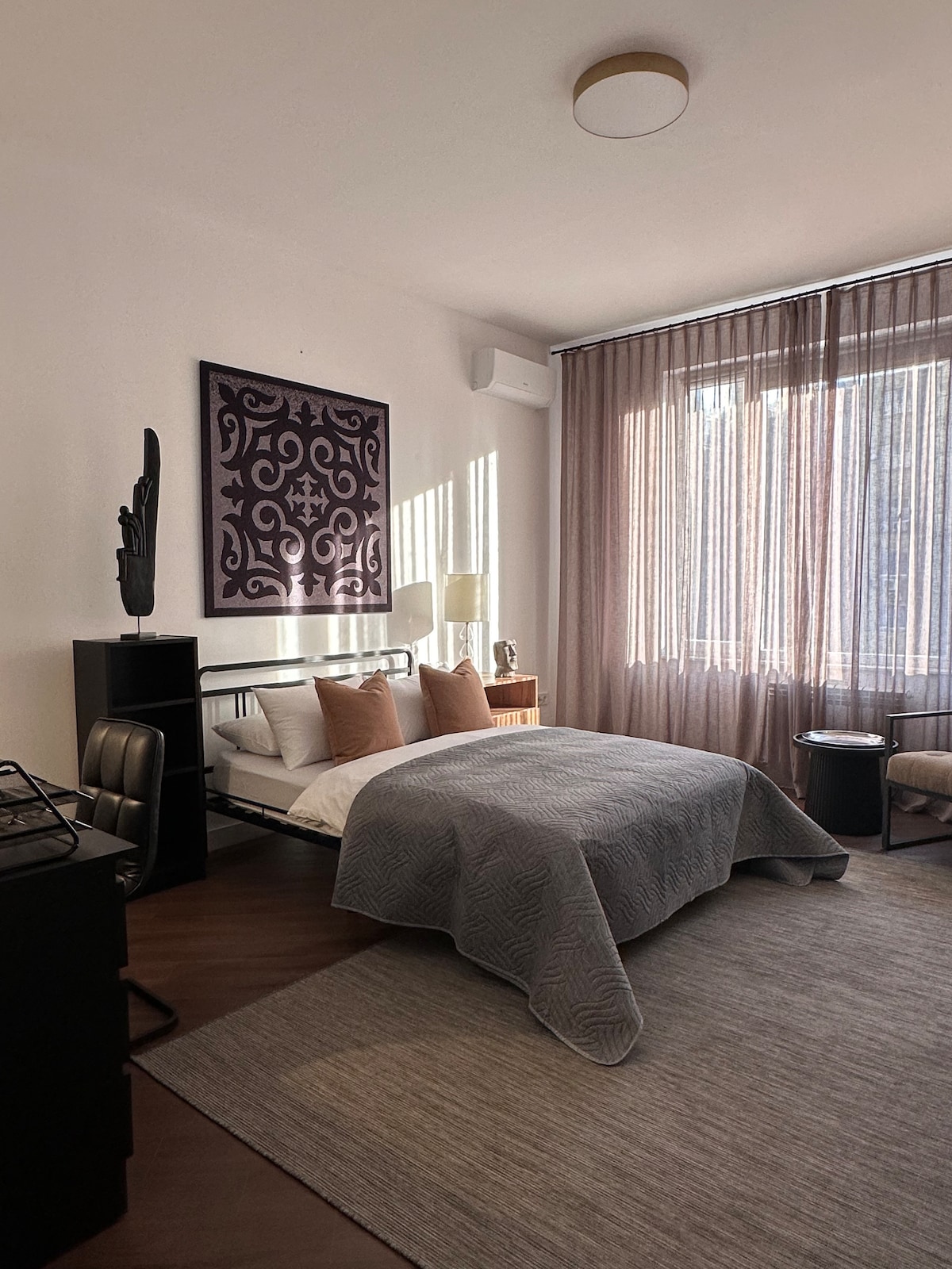 Стильная квартира в самом сердце Алматы — на набережной Esentai, рядом с Esentai Mall, парком и лучшими ресторанами города. Уникальная фреска, уютный камин, дизайнерский декор и вид на горы с 4 этажа создают атмосферу уюта и вдохновения. Полностью оборудованная кухня, техника, винные бокалы и редкие сорта чая. Для гостей при бронировании от 5 ночей — бутылка казахстанского вина Arba Wine в подарок. Пространство 48 м² идеально подойдёт для пары, творческой поездки или путешествия в одиночку.