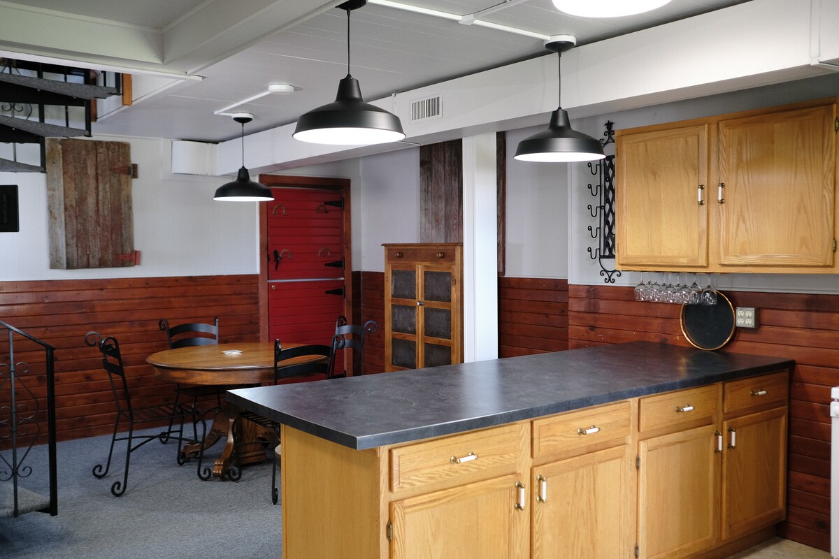 Leider keine Kinder unter 12 Jahren. Dieser große Getreidespeicher wurde mit wiederverwendetem Scheunenholz und vielen Antiquitäten in einen rustikalen, zweistöckigen Rückzugsort umgewandelt. Das 700 Quadratmeter große Hauptgeschoss verfügt über ein komplettes Bad, eine Vintage-Retro-Küchenzeile (Mikrowelle, Toaster, Kaffeemaschine, Kühlschrank mit Gefrierfach, KEIN BACKOFEN), ein Liegesofa, einen Smart-TV mit WLAN und DirecTV sowie einen großen Essbereich mit 2 Tischen. Der 500 Quadratmeter große offene Loftbereich verfügt über ein vollwertiges Bett und 2 Queensize-Betten.