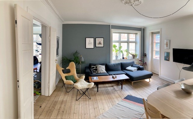 Dear Guest At first glance inside the apartment, your eyes will be fascinated by the high panels, beautiful stucco, French doors and original plank floors. The apartment underwent a complete renovation in 2018 and appears today as modern and clean, but with respect for the old architectural details. The apartment is located on the longest shopping street in Copenhagen surrounded by plenty of restaurants and shopping opportunities. You will also find many sights within a 2 km walking distance.
