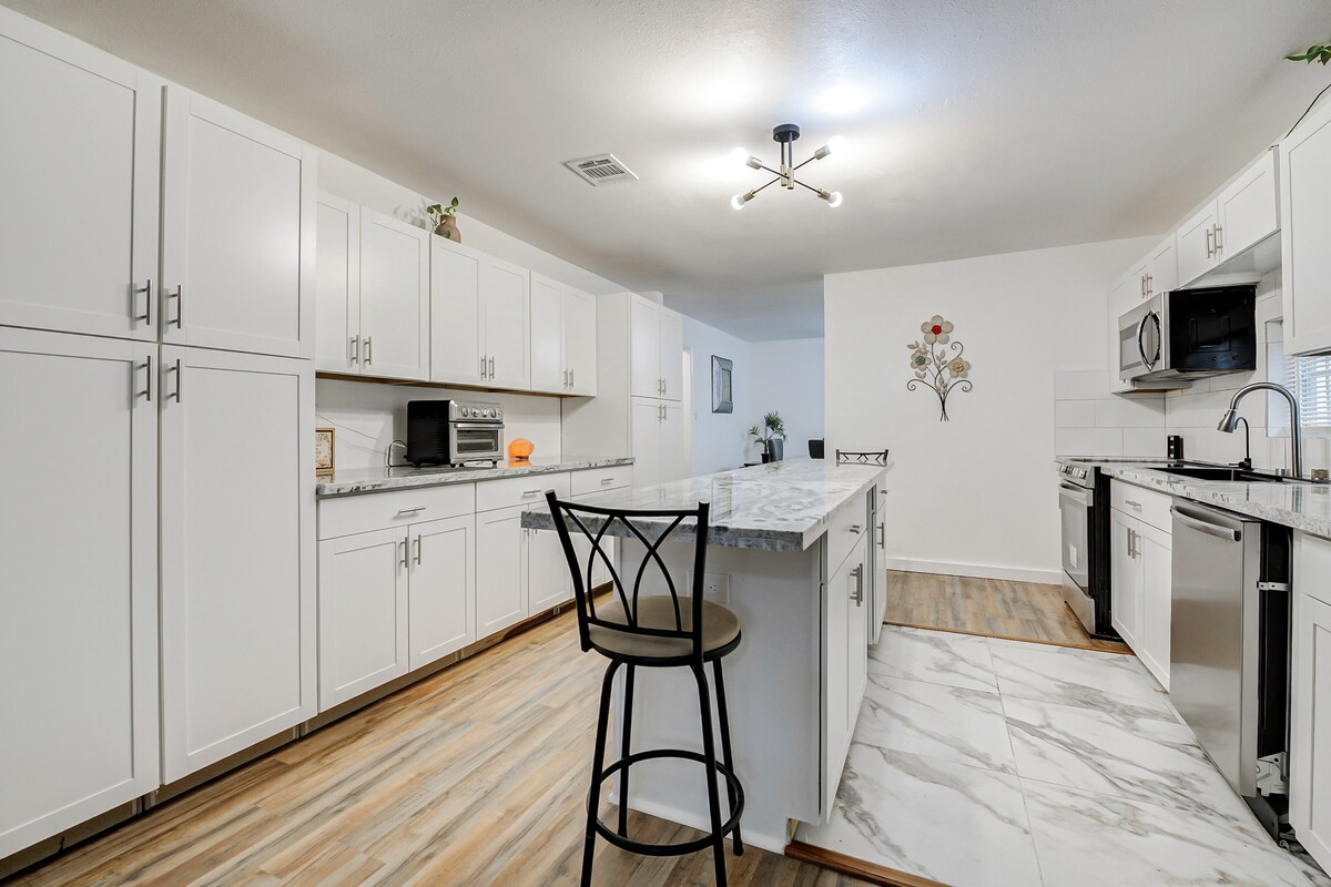 „Die ganze Gruppe wird in diesem zentral gelegenen Haus einen einfachen Zugang zu allem genießen, was Houston zu bieten hat. „MOON LIGHT BY THE BAY“ Bungalow bietet Platz für 6 Gäste, 2 PARKPLÄTZE (kostenlose Parkplätze an der Straße) und einen offenen Küchen-/Wohnbereich. Perfekt für die Unterhaltung von Familie und Freunden. Bietet WLAN, einen Smart-TV und einen Sitzbereich im Freien. Genieße deinen Aufenthalt, indem du dich in der Dusche des Hauptbadezimmers entspannst und dich auf der Couch mit deinem Lieblingsbuch entspannst.“