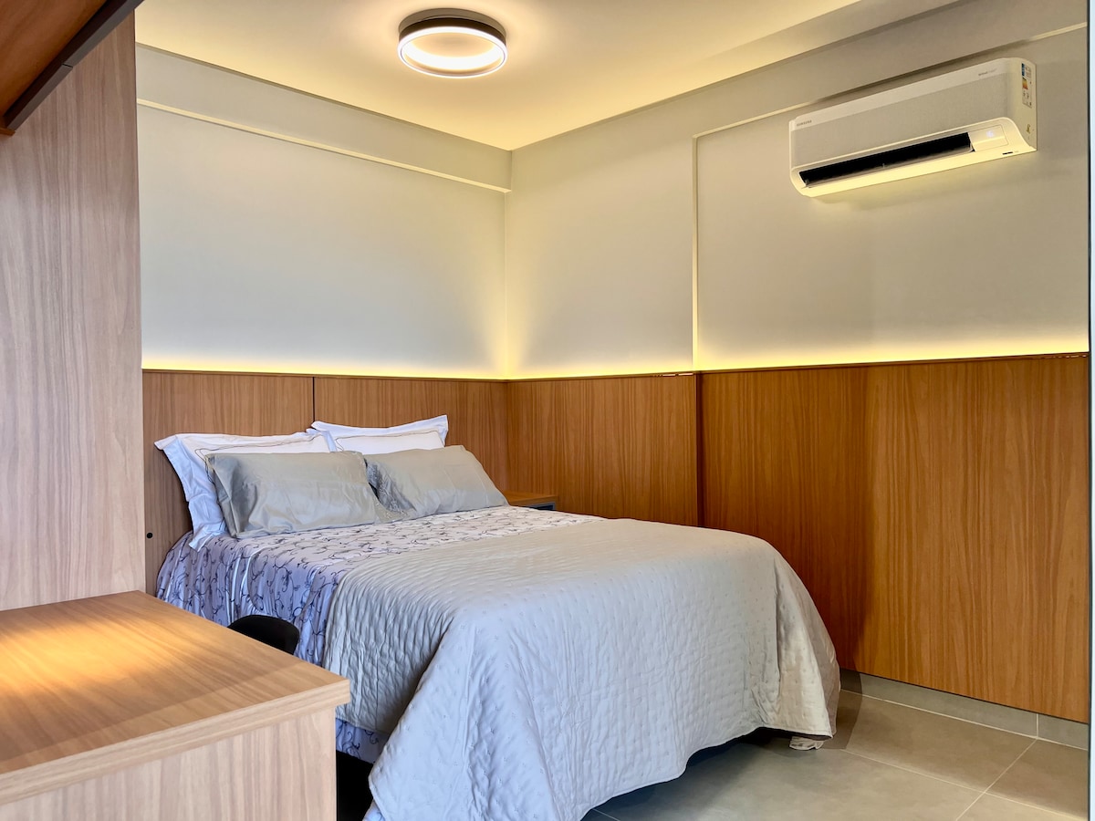 Neu zusammengebautes Kitnet; Comporta 02 Personen, Paar oder Alleinstehende; Drehende Parkplätze kostenlos; Eintritt mit Gesichtserkennung; Alle möbliert: Küchenutensilien, Kühlschrank, Mikrowelle, Fritteuse, Mixer, elektrischer Wasserfilter, Trockner, Bügeleisen; WLAN-Internetzugang und Smart-TV; Doppelbett und Badezimmerset; Mercadinho Auto-Service rund um die Uhr in der Eigentumswohnung selbst; Gemeinsamer Servicebereich mit Waschmaschine und Trockner; Gemeinsamer Freizeitbereich mit Grill, Billardtisch und TV.