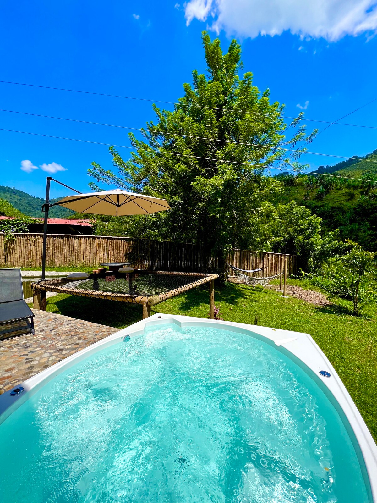 Disfruta de un merecido descanso con todas las comodidades que necesitas en medio de la belleza natural de las montañas. Nuestra cabaña es un oasis de tranquilidad, donde puedes sumergirte en un relajante jacuzzi rodeado de campos de café, ideal para compartir con amigos o con tu pareja. Cada día, te despertarás con el dulce canto de las aves y el aroma del café fresco. Desde aquí, podrás disfrutar de una vista panorámica del municipio de Jardín.