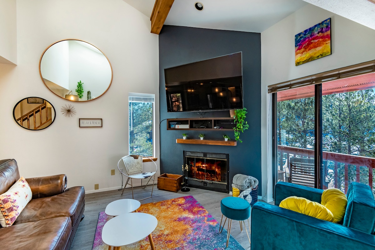 Erst letztes Jahr umgebaut! Ich bin sicher, die coolste Wohnung in Angel Fire zu sein! 😎 Dieses lustige Rendezvous liegt im Wald des Pinetree Commons-Komplexes. Sie ist nur 2 Blocks vom AF Resort entfernt. In der Nähe von Skifahren, Radfahren, Wandern, Golf und mehr! Schnapp dir einen Drink und genieße einen der 2 Außenbalkone oder mach es dir am Kamin gemütlich. Die Innenräume sind unterhaltsam und einladend... mit eklektischen Wandgemälden und Dekoration, die ein anderes Erlebnis bietet als alles andere in der Umgebung! Perfekt für Familien/Freundesgruppen! 😊