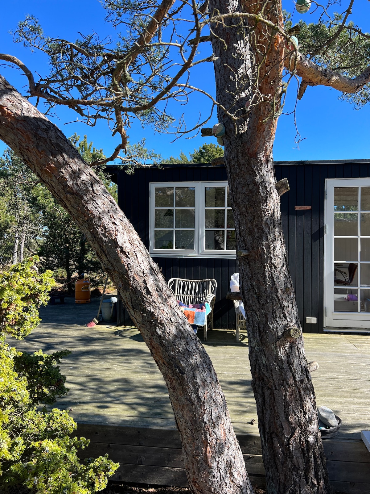 Ein ziemlich einfaches und kleines, aber funktionales 40 m2 großes Haus mit einer ungestörten Lage, auf halbem Weg zwischen dem Hafen und der Stadt. Wenn du auf der Suche nach einem Luxushaus bist, ist dies nicht das Haus, das diesen Bedarf erfüllt. Westseitige überdachte 20 m² große Terrasse. Küche, 2 Induktionskochfelder. Der Kühlschrank befindet sich im Schuppen neben der Terrasse. Ess-/Wohnzimmer mit Holzofen, elektrische Heizung, 2 Schlafzimmer mit Einzelbetten, Doppelbett 140 cm im Wohnzimmer, WC mit Waschbecken, es gibt nur eine Außendusche mit warmem und kaltem Wasser.