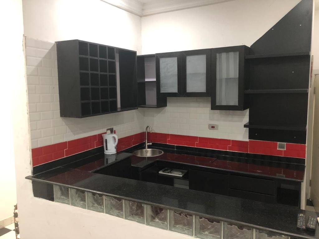 Eine Wohnung mit einem Schlafzimmer, einem Badezimmer und einem Wohnzimmer mit einer Mischung aus afrozentrischen und modernen, modernen Holzdesigns. Hauseigenes Restaurant, Fitnessraum und Kaffeelounge, Außenpool mit Pergola am Pool, 24/7 Strom, Sicherheit und CCTV. Es ist ideal für lange und kurze Aufenthalte mit mindestens drei Tagen, fünf Fahrminuten vom internationalen Flughafen und zwölf Fahrminuten vom Inlandsflughafen entfernt. Abhol- und Rücktransport vom Flughafen verfügbar