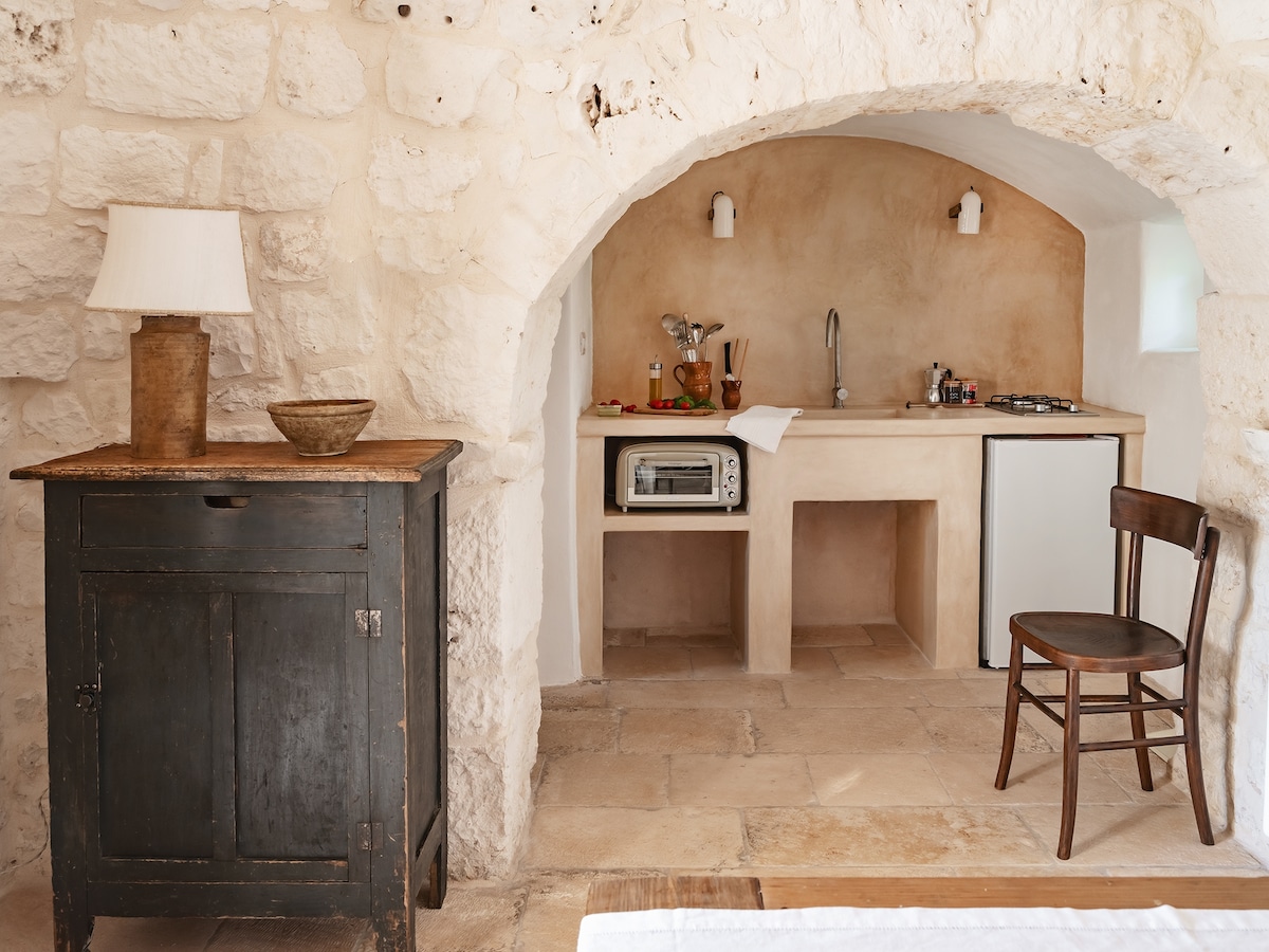 Ein renovierter Trullo in ruhiger Lage auf dem Land mit authentischem Stil, die meisten Innenräume sind recycelt oder alte Möbel wurden auf moderne und funktionale Weise neu erfunden. Verfügt über 1 Schlafzimmer mit Doppelbett und 1 Schlafsofa im Wohnzimmer. Ein neu renoviertes Badezimmer mit Dusche, eine voll ausgestattete Küche, eine Waschmaschine und viel Platz im Freien (eine Terrasse vom Schlafzimmer aus zugänglich und eine auf der anderen Seite mit Grill) Der Zugang zum Swimmingpool wird mit den Gästen der anderen 2 Unterkünfte geteilt (keine externen).