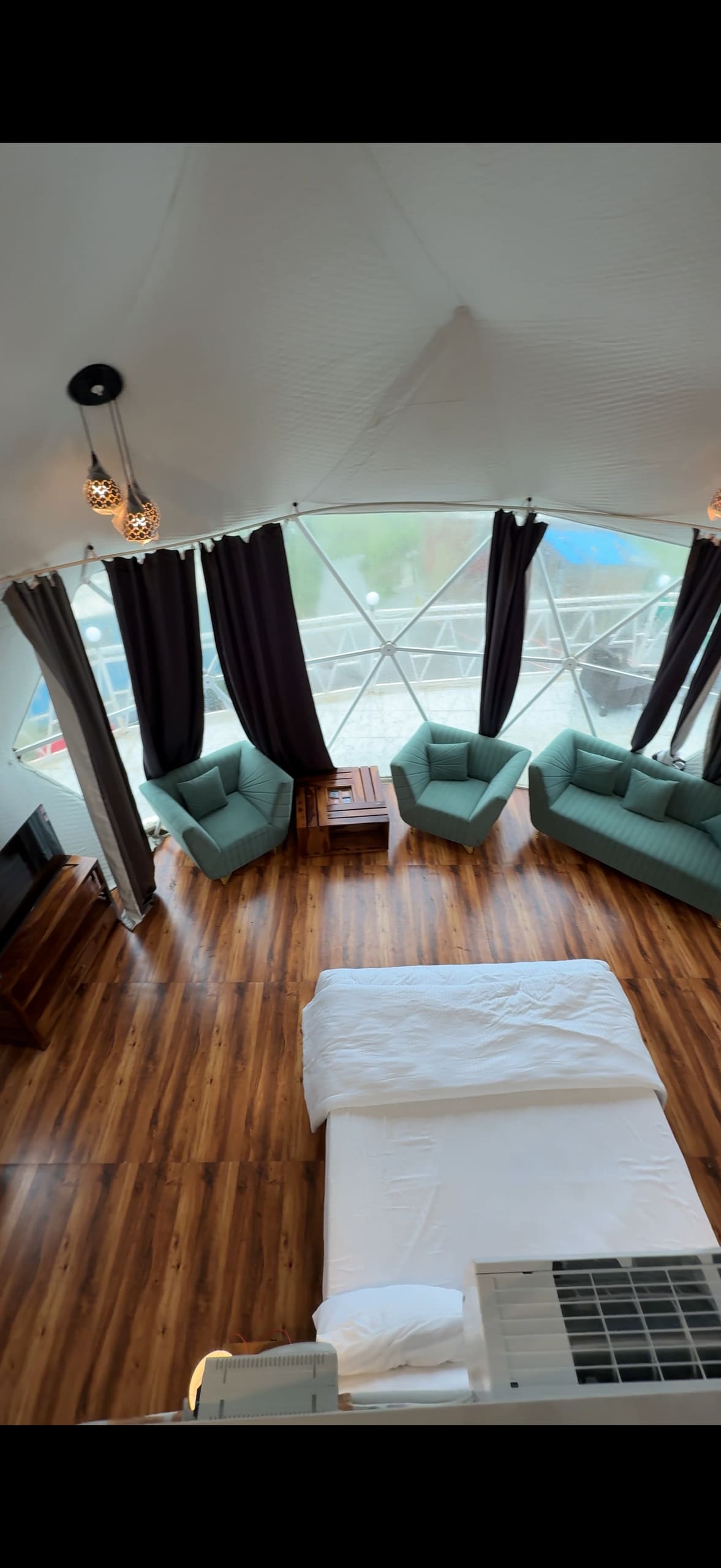 Dieses schöne Setup befindet sich im Total Support Desert Camp und verfügt über eine luxuriöse Glamping-Kuppel im Bubble-Stil mit einem gemütlichen Doppelbett, eleganten Vorhängen, Umgebungsbeleuchtung und einem Holzboden. Die transparente Kuppeldecke bietet einen perfekten Blick auf den Wüstenhimmel – ideal für romantische Ausflüge, Sternenbeobachtung oder einfach nur, um die Ruhe der Dünen bequem zu genießen.
