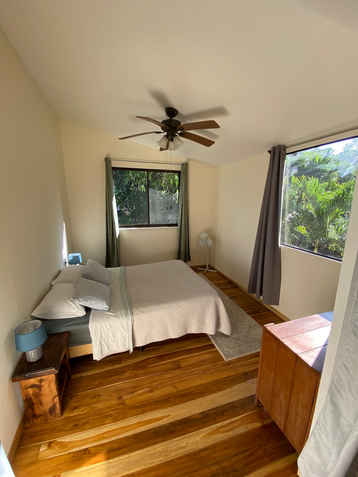 Thoughtfully designed, this elevated and high ceiling house offer all the comfort and convenience needed for both short and extended stays. - Loft bedroom with queen-size bed - Living room, sofa bed (medium) - Spacious and sunlit - Desk - Bathroom w/ rain shower - AC, ceiling fans - 100mb Wi-Fi - Safe box - Fully equipped kitchen (stove, fridge, microwave, coffee maker, more. - Covered terrace - Large sliding glass doors (w/ screens) - Laundry - Pool - Outdoor shower - Private & secure parking