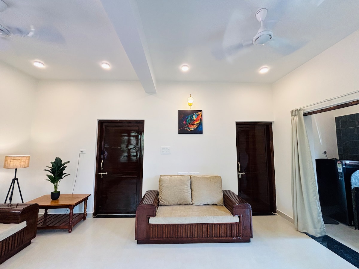 Gönne dir unser handgefertigtes, schickes 1BHK-Refugium mit einem geräumigen Wohnzimmer mit Plüschsofas und einem Marmor-Couchtisch. Entspanne dich im Queensize-Bett mit einer Premium-Schaumstoffmatratze. Die voll ausgestattete Küche bietet moderne Geräte und Ausblicke auf üppige Felder. Entspanne dich an der Marmorbar oder den Hängestühlen auf dem Balkon und genieße den ruhigen Chikoo-Baum und gelegentliche Affenbesuche. Erlebe Luxus und Ruhe in jedem Detail unseres eleganten Raumes.