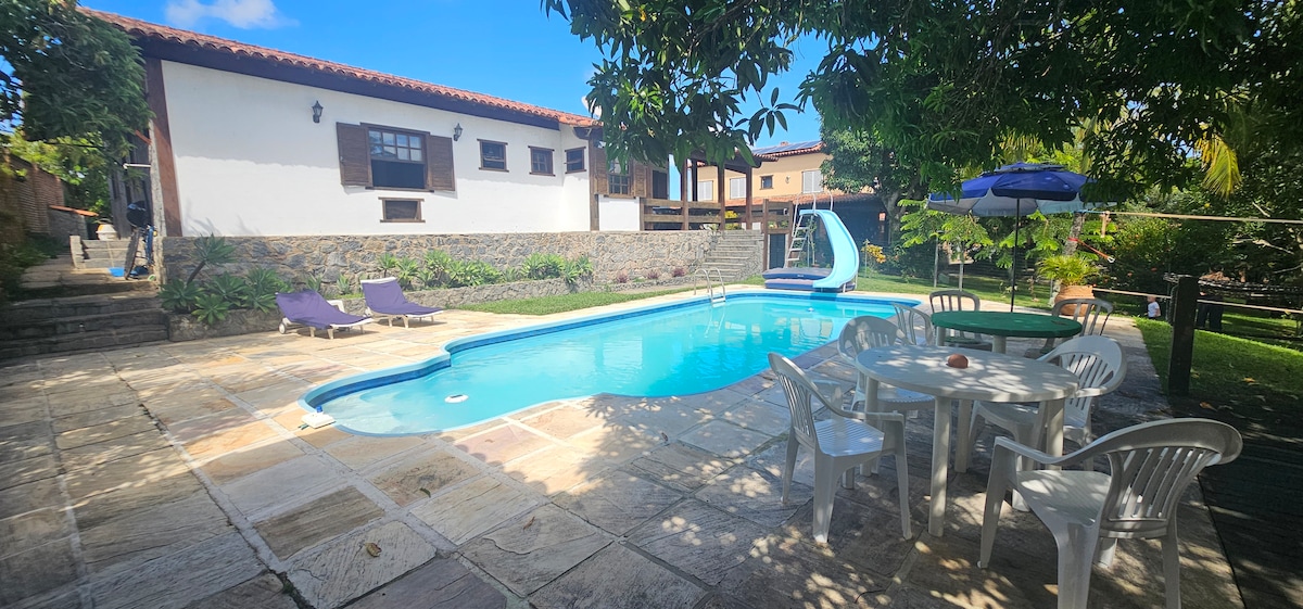 Ganzes in der Nähe der Strände von Ponta da Farinha und Ubás (Blaues Qualitätssiegel)! (Entfernung von 2,5 km) Privater Pool, Gourmetbereich mit Grill und Holzofen, Kinderspielplatz und großer Hof. Klimatisiertes Zimmer, ausgestattete Küche, WLAN und Parkplatz für 2 Autos. Perfekt für Familien und Gruppen, die Komfort und Privatsphäre suchen. Einfacher Zugang zu Arraial do Cabo (40 Min.), Búzios (50 Min.) und Cabo Frio (30 Min.). @quintaldomariguaba