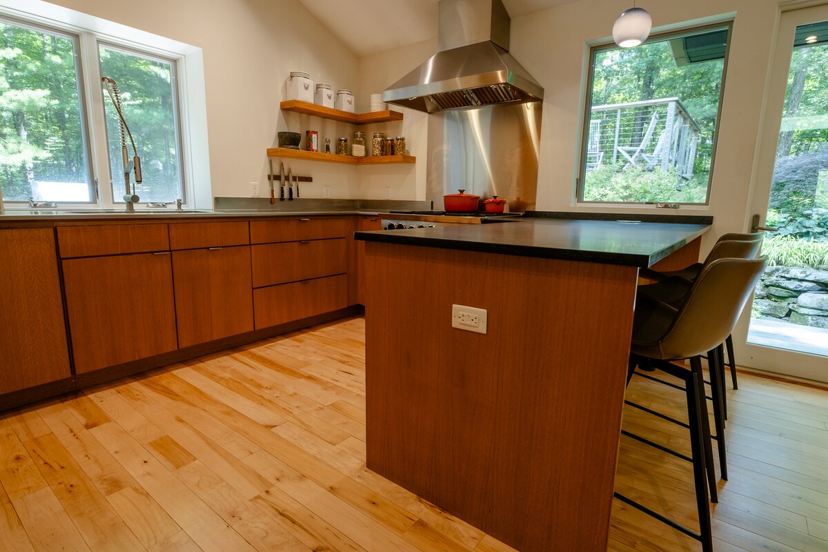 Atme aus und tanke neue Energie in diesem luxuriösen Raum am Fuß der Shawangunk Mountains. Dieses Juwel verfügt über eine offene Küche und ein Wohnzimmer, perfekt für die Verbindung mit der Natur. Genieße das hochwertige Foster-Ledersofa, gemütliche Filmabende auf einer 120-Zoll-Projektionsfläche und einen Holzofen für kühle Abende. Jedes Detail, von frischer Bettwäsche bis hin zu einer bedeutungsvollen Bibliothek, ist sorgfältig kuratiert. Entdecke versteckte Botschaften im ganzen Haus, die dich einladen, diesen ruhigen Rückzugsort zu erkunden und dich zu entspannen.