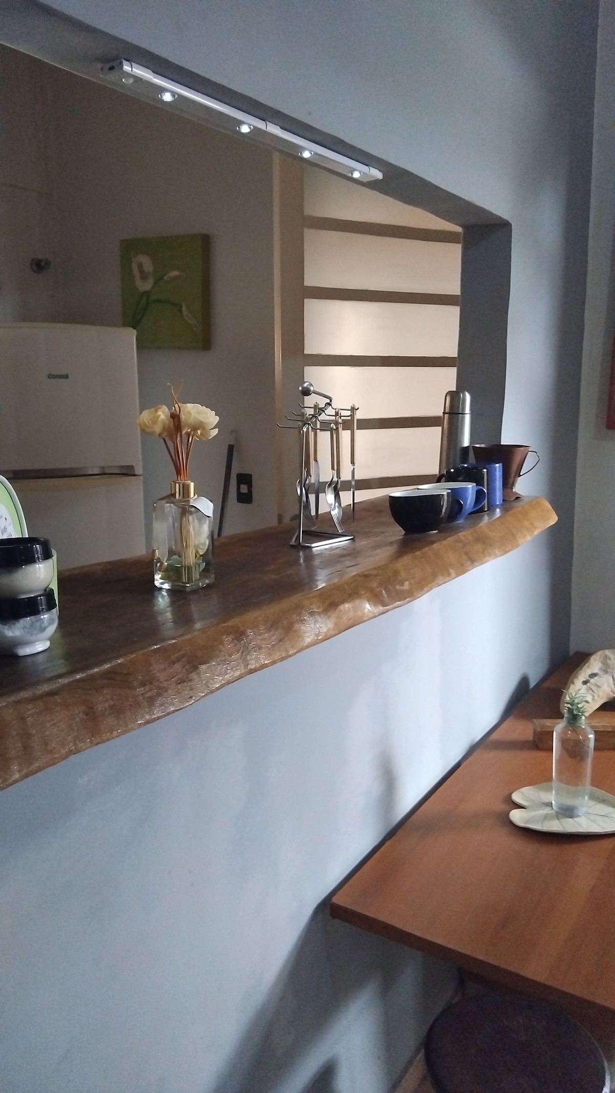 quitinete de 38m2, com cama de casal, armário, sofá, ar cond. frio, smart TV, wi-fi, escrivaninha de trabalho, decoração moderna, cozinha integrada com geladeira, microondas, fogão de indução, cafeteira nespresso, filtro de água, armários, louças e talheres, ferro elétrico e tábua de passar, secador de cabelo. Internet de alta velocidade, escrivaninha, local ideal pra Home Office.