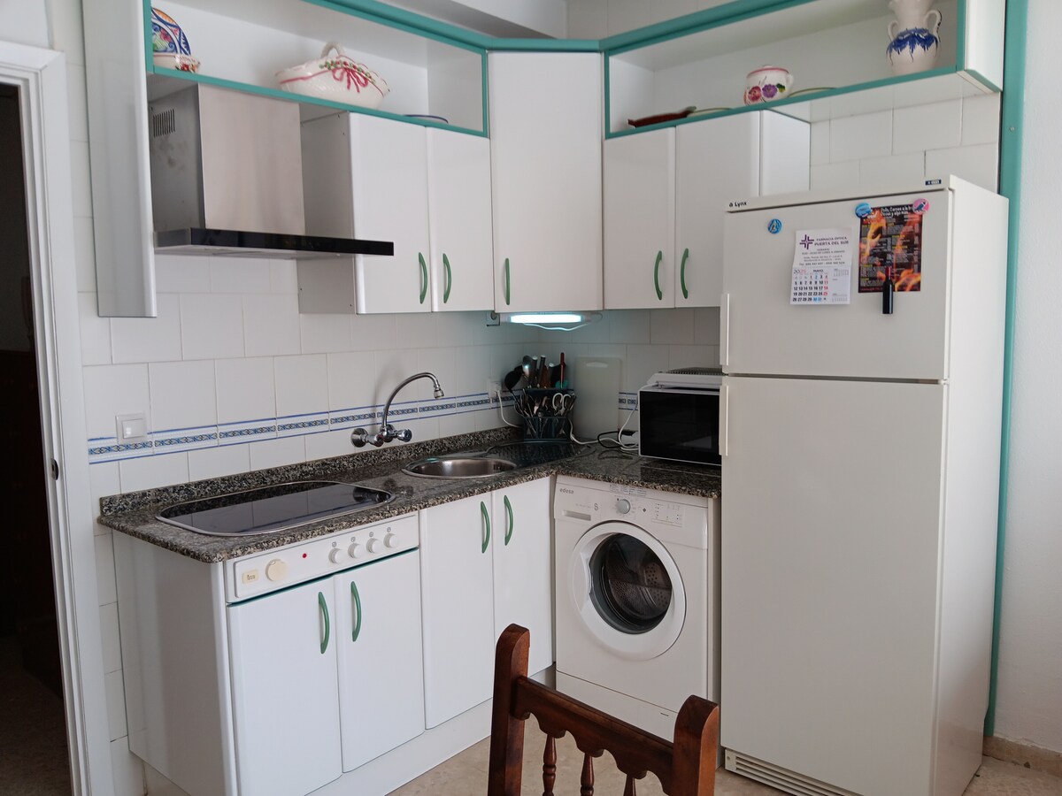 Schöne und gemütliche Wohnung im Erdgeschoss mit geräumiger Terrasse, die mit einer anderen Wohnung geteilt wird. Ruhige Gegend. Sie besteht aus einem Schlafzimmer mit einem Doppelbett und einem Schlafsofa im Wohnzimmer (sowohl mit Klimaanlage als auch mit Ventilator). Badezimmer und Küche (Mikrowelle, Toaster, Kaffeemaschine und notwendige Utensilien). 7min (550m) vom Strand entfernt. 600m vom Zentrum entfernt. Umgeben von allen Arten von Dienstleistungen weniger als 200m (Bars, Supermärkte, Geschäfte, Apotheken, etc.). KOSTENLOSES WLAN. KLIMAANLAGE SEPARAT BEZAHLT