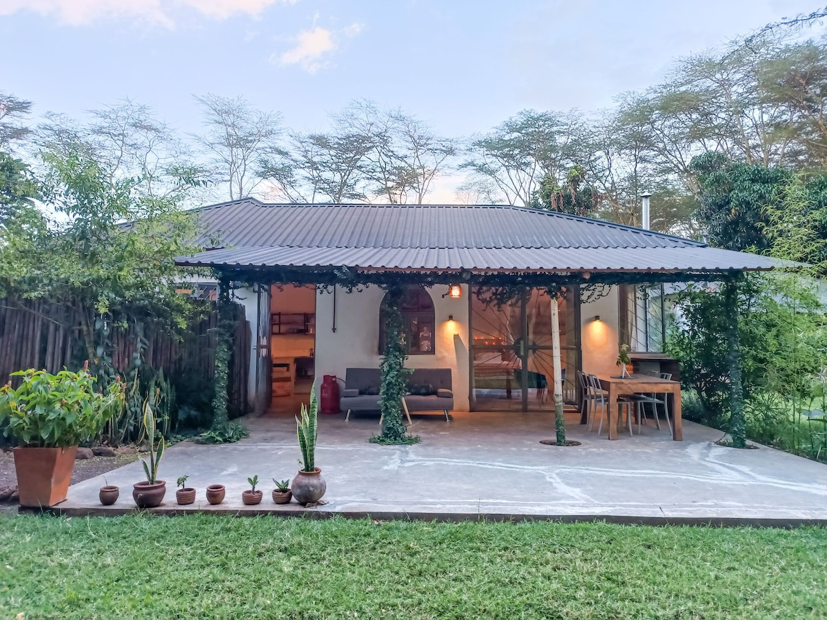 This Round Cottage, made from rocks and mud in a lush forest, stays cool on hot days. Surrounded by monkeys and bird life, with nature walks starting from the porch. A large pond in front offers amazing birdlife, and there's only one house in sight. Safe parking is available 50 meters away. Perfect for up to two adults and pet-friendly. Features a firewood stove, hot water facilities, and an ecological dry toilet. Less than 10 minutes from Arusha-Moshi road and 30 minutes from the KIA airport.