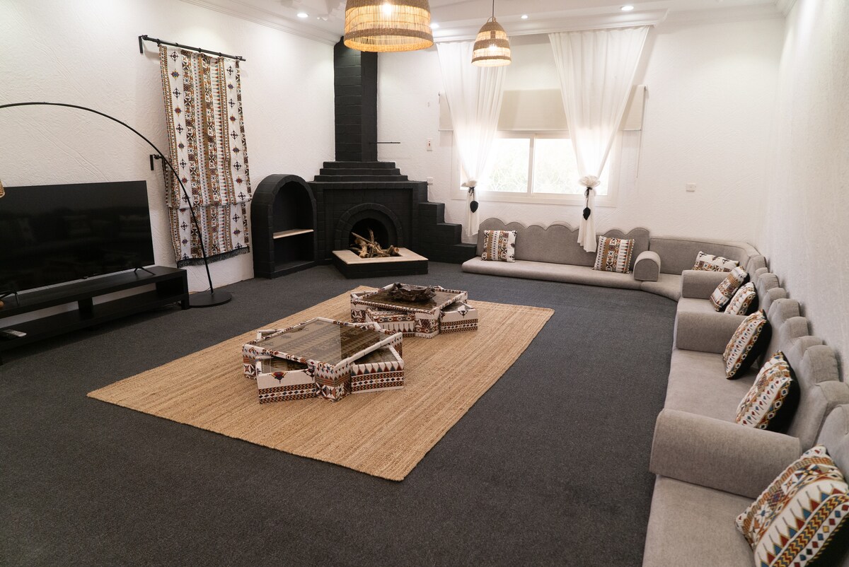 Entspanne dich mit der ganzen Familie oder mit Freunden in dieser ruhigen Unterkunft mit 3 Schlafzimmern. Möblierte Veranda und Terrasse mit Gasfeuerstelle (im Winter in Betrieb), Medienraum mit Projektor und Netflix, STCtv und Shahid VIP TV, beheizter Innenpool (nur im Sommer in Betrieb), zwei Familienzimmer, voll ausgestattete Küche, Waschmaschine, 4 Bäder mit WC, kostenloser Parkplatz für 8 Autos, privates Zimmer für den Fahrer mit Küche und Bad.