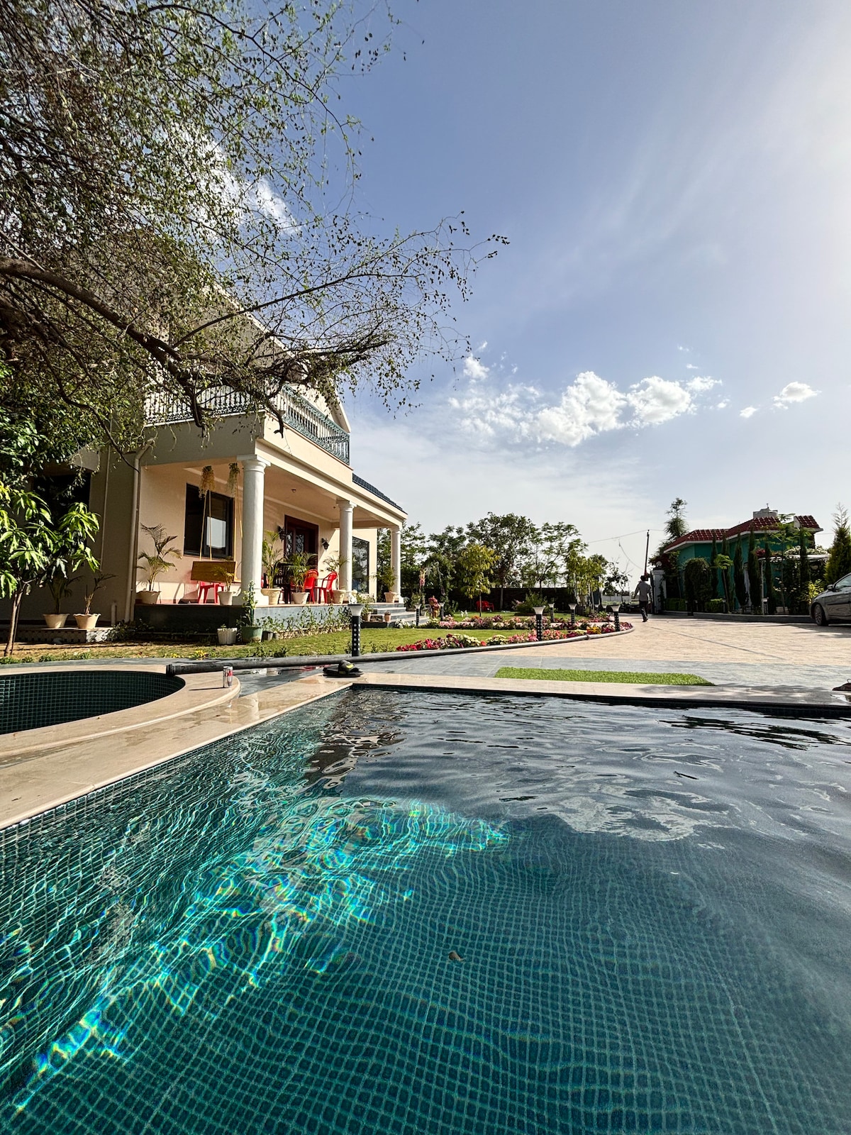 Relax with the sounds of birds when you stay with us at Luomo/Shri Ram Upvan, a farm where our family from Delhi practices organic farming. Enjoy learning about growing various crops, fruits, and vegetables as you stroll through the farms during your evening walk. The pool with fresh water awaits you. (We repurpose all the water for our plants afterward) The tastefully designed house keeps you connected to the outdoors with large glass windows overlooking the farm and serene mountain views.