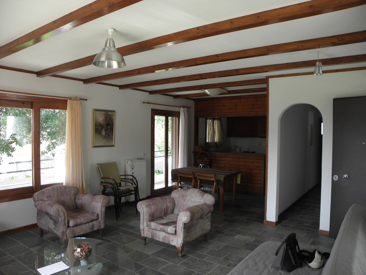 Entspannen Sie sich in diesem ruhigen, eleganten Raum. In einem großen Garten, gegenüber dem Meer 50 Meter, zwei Terrassen und ein Hinterhof, um die Bäume und das Grün zu genießen, ein Schlafzimmer mit zwei Betten und in einem anderen Zimmer ein Schlafsofa und bei Bedarf ein kleines Sofa für eine weitere Person. Wohnzimmer, WC, Küche und Flur. Ganz in der Nähe befinden sich Restaurants und Cafés direkt am Meer, einfacher Zugang zum Markt von Voula.
