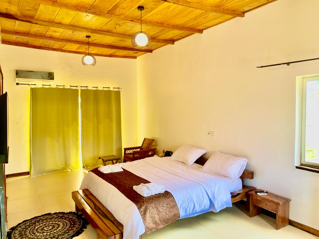 Geräumiges Schlafzimmer, fein eingerichtet mit Details, die das Wissen der beninesischen Künstler und Handwerker hervorheben. Neben dem Komfort des Zimmers profitierst du von einem großen Ankleidezimmer, einer Dusche mit Mosaikwand, einem Fernseher und unbegrenztem Internetzugang.