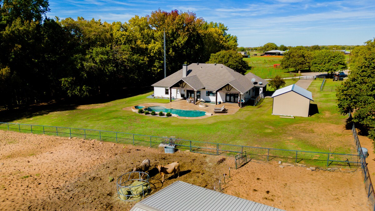 Herrliches Bauernhaus auf 7 Hektar großer Ranch mit Pool, Whirlpool. Ruhige Lage mit einfachem Zugang zu Aubrey, Denton, Pilot Point, Celina & Hochzeitslocations, Restaurants & Geschäften. Dieses charmante Bauernhaus verfügt über 4 Schlafzimmer und 3 Badezimmer. Dieses Haus ist perfekt für große Familientreffen und Wiedervereinigungen. Schöner Pool im Boden und Feuerstelle mit Blick auf 3 vollständig eingezäunte Weiden Viele schöne Bäume und ein kleiner, fließender Bach mit 2 großen Terrassen. Ruhige Lage mit einfachem Zugang direkt am Highway 377 & 380.