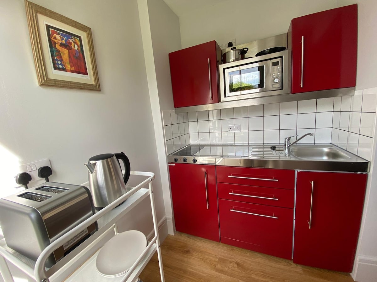 The Goldfinch is a beautiful, spacious studio apartment for two with private entrance and huge garden. On the ground floor of our lovely farmhouse, this apartment offers comfortable seating, dining space, wood burning stove and well equipped small kitchen area with fridge, hob, combination microwave oven and dishwasher. Very comfortable king size bed and bathroom with large walk in shower and Japanese style shower toilet. Complimentary Scottish Fine Soaps toiletries. Self check in is available