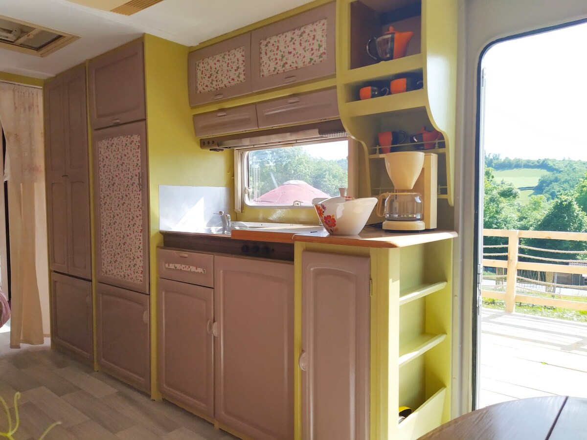 Dieser Wohnwagen wurde von uns gebaut. Er bietet Platz für vier Personen, Sie finden ein Schlafzimmer mit einem Doppelbett von 140 cm und zwei Betten von 90 cm in einer Nische im Wohnzimmer. Er ist mit einem Badezimmer und einer Küchenzeile ausgestattet. Sie haben eine Terrasse, um die Ruhe zu genießen. Wir haben die Möglichkeit, Ihnen die Mahlzeiten vor Ort zu liefern, um Ihren Aufenthalt in vollen Zügen zu genießen. Bewundern Sie die einzigartigen Details dieser romantischen Unterkunft.