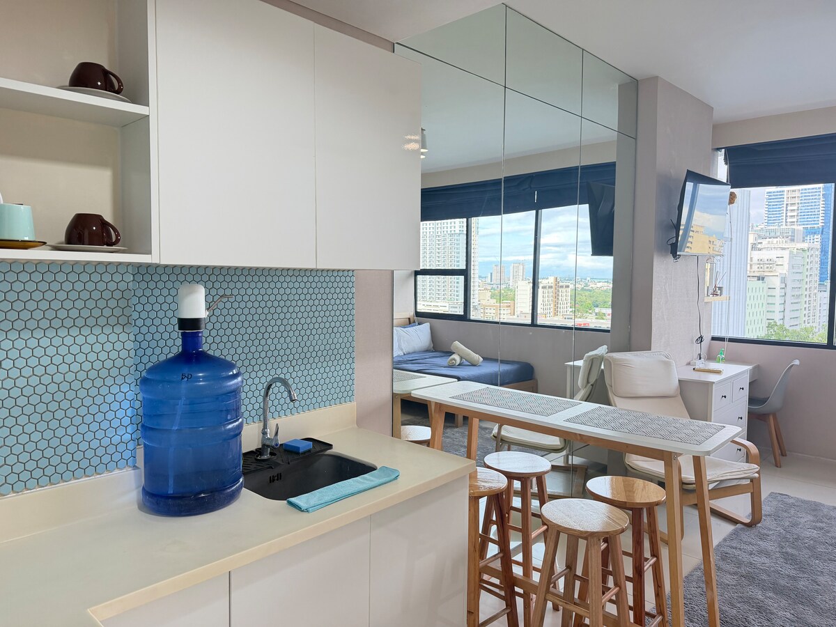 Ferienwohnung mit Blick auf die Stadt in Cebu City. Nur 5 Gehminuten vom Ayala Center Cebu, IT Park, Restaurants, Cafés und Geschäften entfernt, ist dieses moderne Studio perfekt für Stadterkunder, digitale Nomaden und Wochenendausflüge. Genieße einen atemberaubenden Blick auf die Skyline, Highspeed-WLAN, einen Smart-TV mit Netflix und alles, was du für einen angenehmen Aufenthalt benötigst. Die Unterkunft verfügt über eine Mikrowelle, einen Toaster, einen Reiskocher, einen Minikühlschrank und einen Wasserkocher – perfekt für leichte Mahlzeiten (Hinweis: Kochen ist nicht erlaubt).