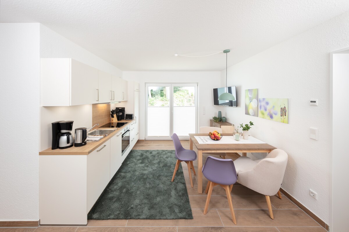Das modern eingerichtete Apartment bietet alles- was einen Aufenthalt erleichtert. Es ist nah an der Natur. Küche/Wohnzimmer sind kombiniert. Die Ausstattung mit u.a. Herd, Backofen, Mikrowelle, Spülmaschine gibt Ihnen viele Möglichkeiten sich zu versorgen. Ein Schlafzimmer ist mit einem Doppelbett ausgestattet. Das 2. mit einem Etagenbett. Ein Kleiderschrank, Fernseher und co. sind ebenfalls vorhanden. Das Bad ist u.a. mit einer ebenerdigen Dusche ausgestattet.