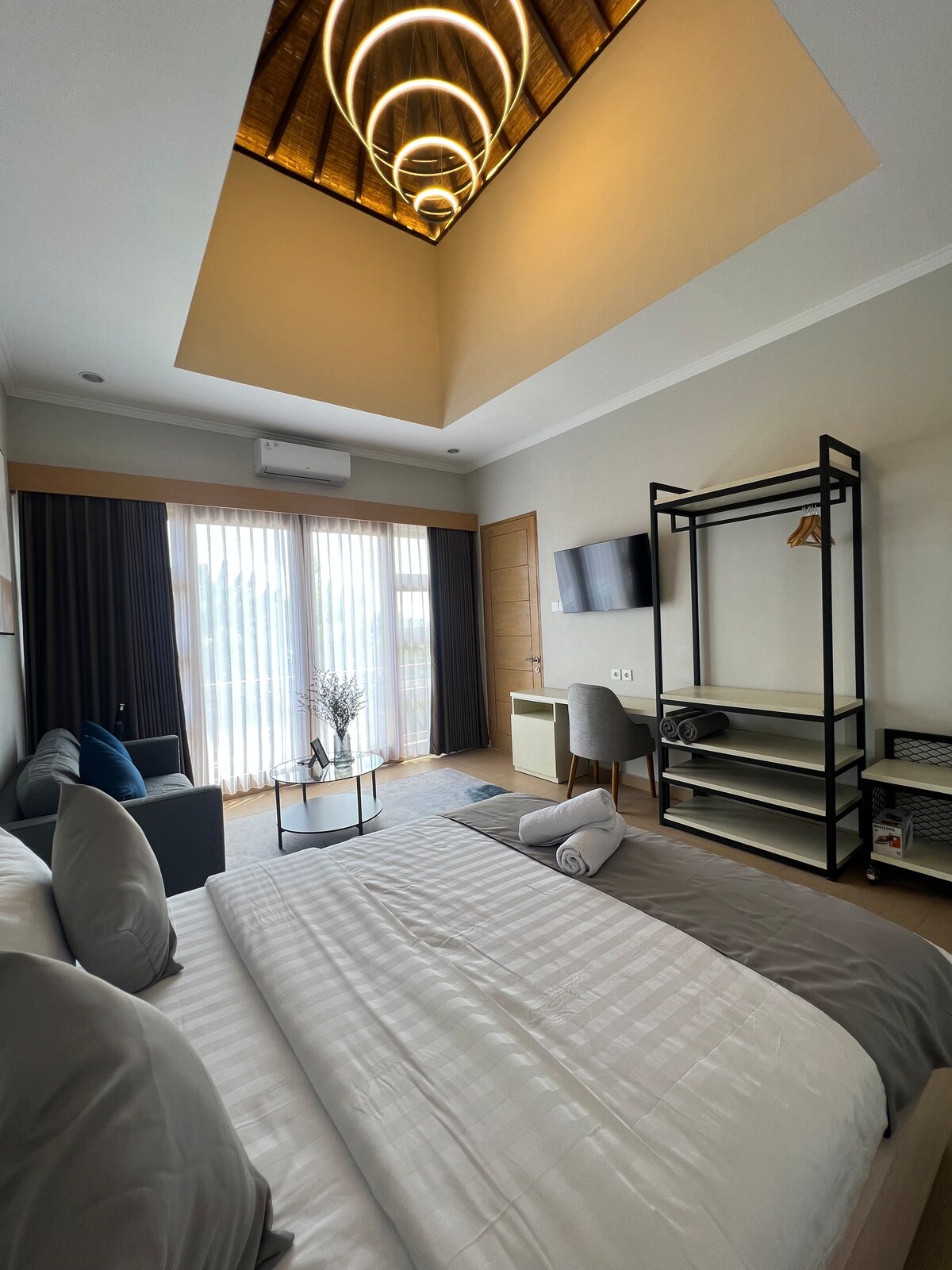 Modernes Zimmer mit bodentiefen Fenstern, Canggu.