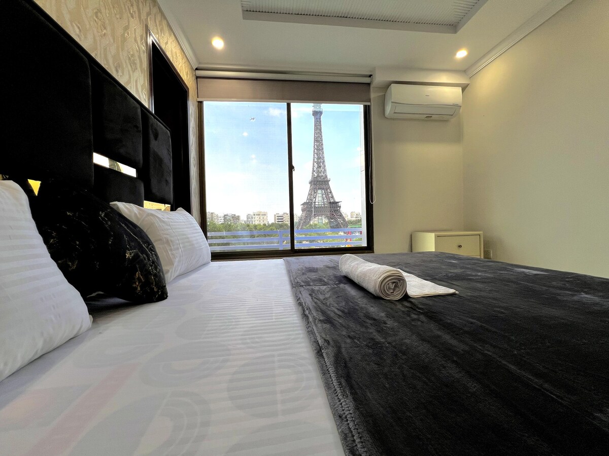Enjoy a peaceful stay in this cozy 1-bedroom apartment with a comfy double bed. The open-plan living area connects to a fully equipped kitchen and a private balcony with an Eiffel Tower view. Located near top dining spots like Salt & Pepper, Chow Ming, Gloria Jeans, Johnny & Jugnu, and McDonald's, everything you need is right at your doorstep.