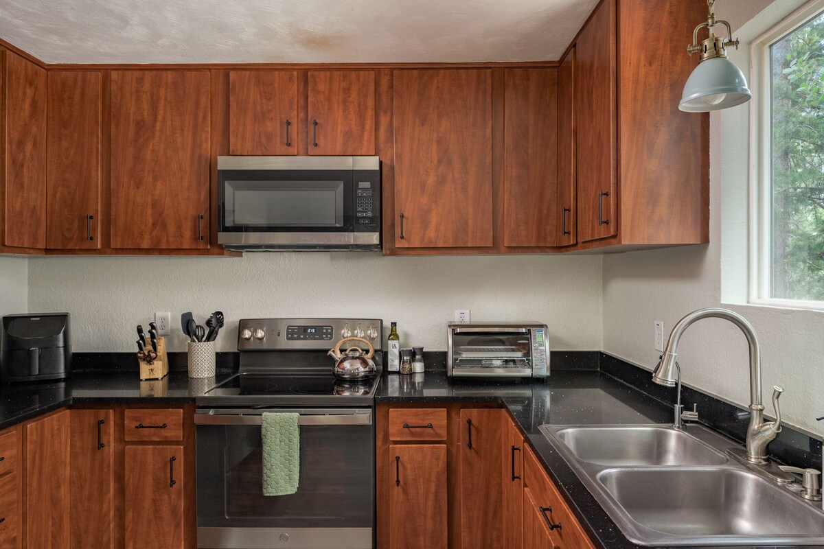 Kick back and relax in this tranquil, stylish, brand new build. Brand new smart appliances with an open kitchen for hosting or head into town for some local and delicious food options. On a quiet road with wooded tall trees, mountain views, friendly deer visits, and hummingbirds that buzz on by. Take in the sunsets, sunrises, and the moonlight from the front or back balcony. Access the private back balcony from your rooms. Plenty of outdoor options year round.