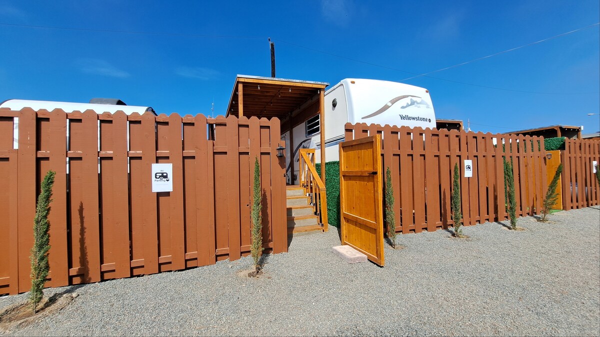 Komfortables Wohnmobil in der privaten Puesta del Sol mit 24-Stunden-Zugangskontrolle, ausgestattet mit allem, was Sie für einen angenehmen Aufenthalt benötigen, in der Nähe von El Valle de Guadalupe und dem Touristengebiet von Ensenada, in der Nähe von Brauereien, Restaurants und Supermärkten Es verfügt über einen Grillbereich und einen exklusiven Aussichtspunkt für unsere Gäste im Trailer Park-Bereich, von dem aus Sie die Sonnenuntergänge genießen können.