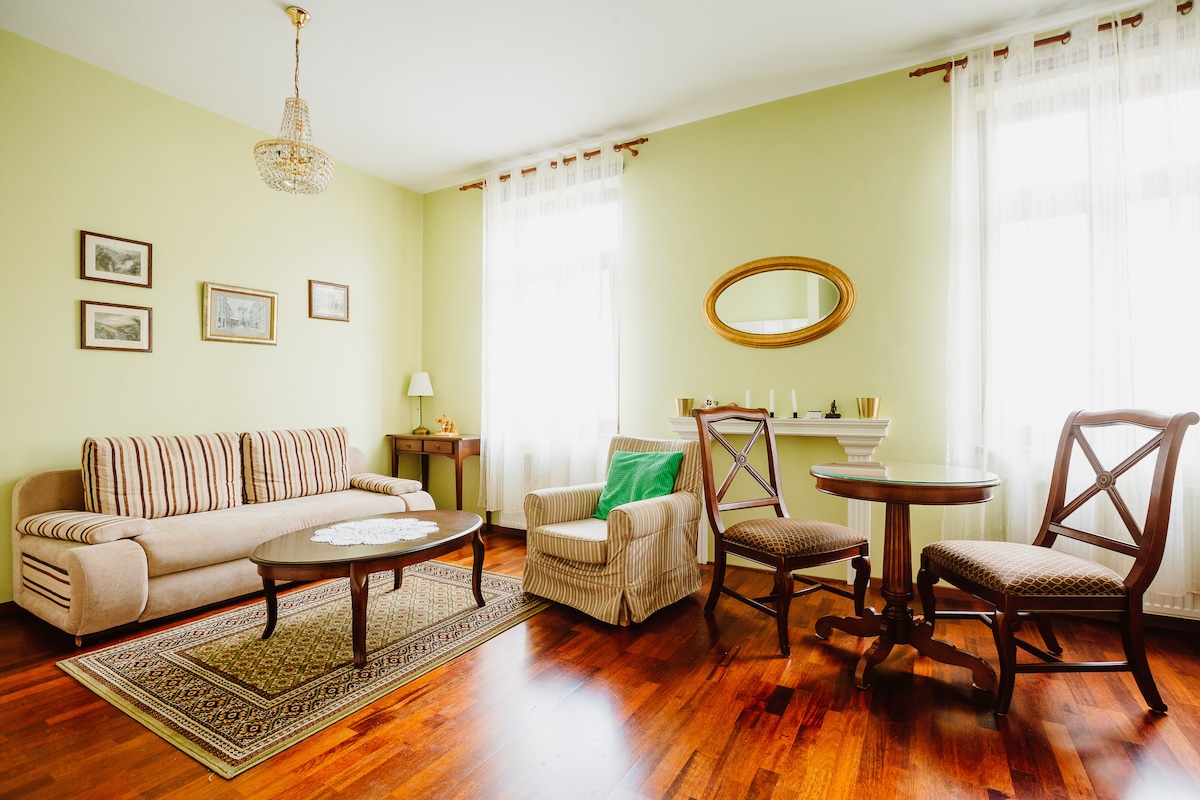 Zentral gelegene klassische Vintage-Design-Wohnung im zweiten Stock eines historischen Mietshauses mit eigenem Balkon, Straßen- und Innenhofblick, Wohnzimmer, voll ausgestatteter Küche, Essbereich, großem eigenem Bad, zwei privaten Schlafzimmern, jeweils mit einem komfortablen Doppelbett eingerichtet. Klimaanlage, Heizung, Netflix, WLAN, Waschtrockner und andere Annehmlichkeiten für Kurz- oder Langzeitaufenthalte in Krakau.
