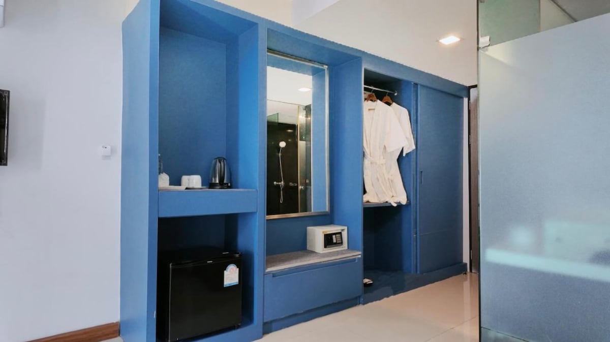 Zimmer im Minimalstil mit Zugang zu einem Swimmingpool auf der Dachterrasse. Das Hotel liegt in der Nähe von Central Bangna, MRT Si-Iam, BITEC Bangna und 10 Minuten vom BTS Udom-Suk sowie einem 24-Stunden-Lebensmittelgeschäft entfernt. In unserer Lobby gibt es Pokhavadi Coffee, ein Bio-Café mit Speisen und Getränken.