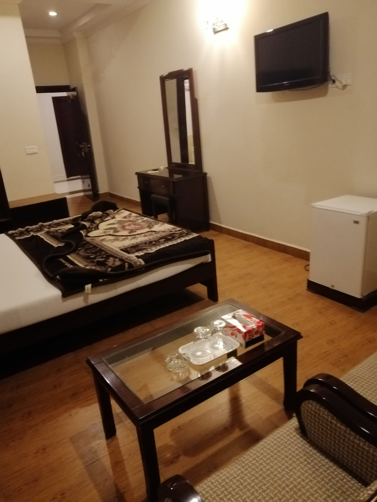 Tritt ein in ein stilvolles, modernes Schlafzimmer mit warmer LED-Beleuchtung, einem komfortablen Kingsize-Bett und einer entspannenden Atmosphäre. Perfekt für Gäste, die einen sauberen, luxuriösen und beruhigenden Aufenthalt in Sahiwal lieben.